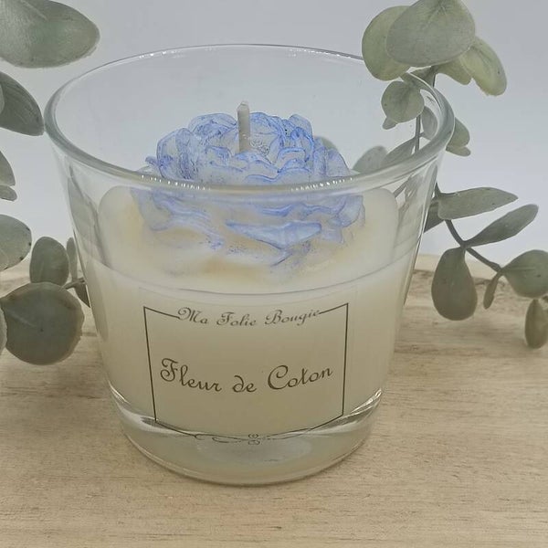 Je vous propose cette bougie, en modèle unique, joliment agrémentée d'une fleur en cire .