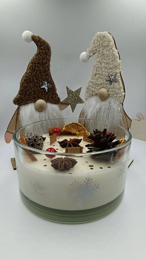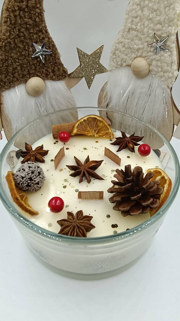 Laissez-vous séduire par sa décoration raffinée, ornée de bâtons de cannelle, d'oranges séchées et d'autres agréments festifs qui ajoutent une touche d'élégance à votre table. Cette bougie deviendra le joyau de votre décoration de fête, apportant une lueur douce et apaisante à vos soirées festives.