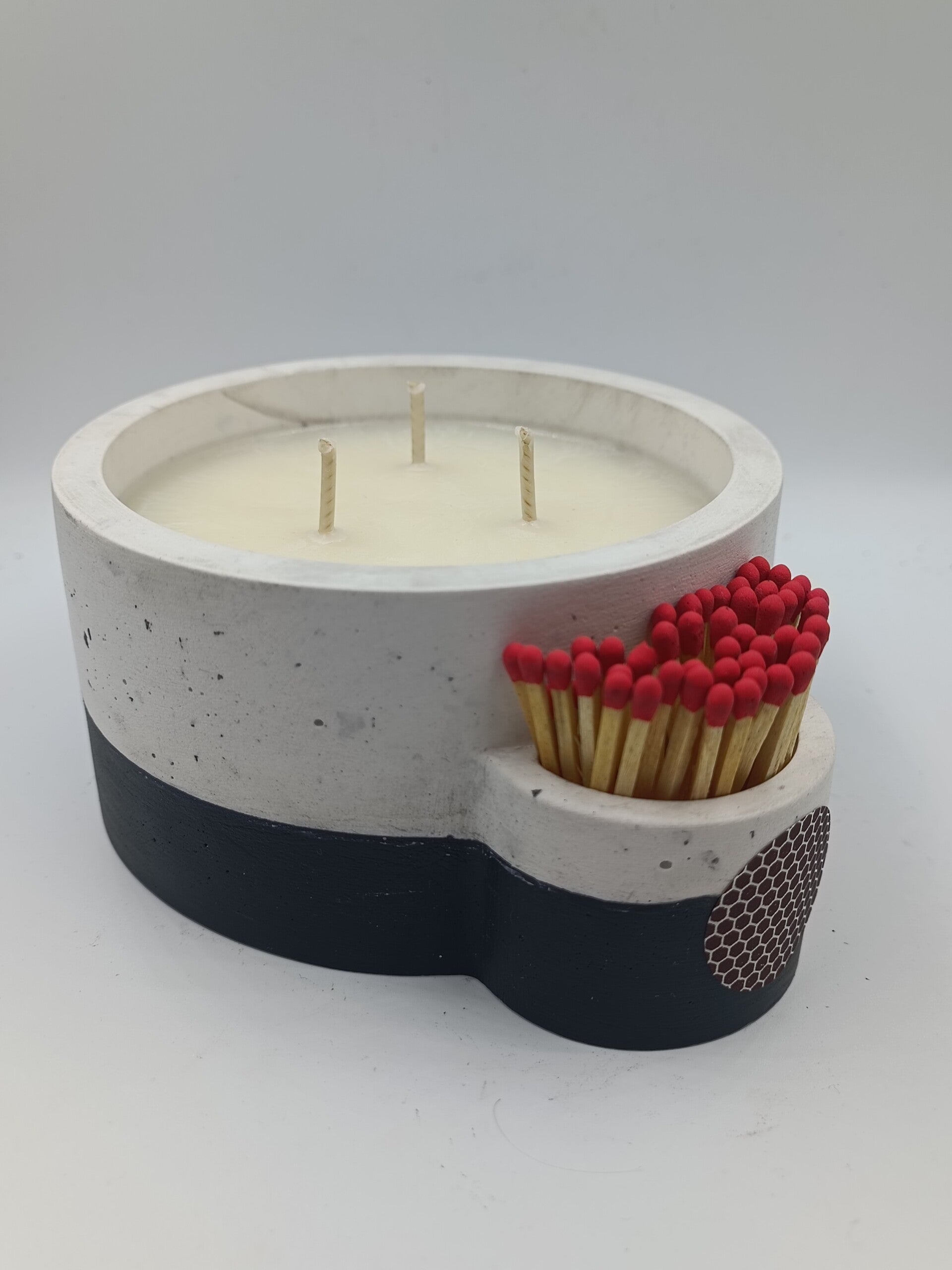 Son contenant, réalisé par mes soins, à la fois raffiné et ingénieux, intègre un compartiment pour ranger des allumettes, vous permettant d'allumer votre bougie à tout moment, avec élégance et simplicité.