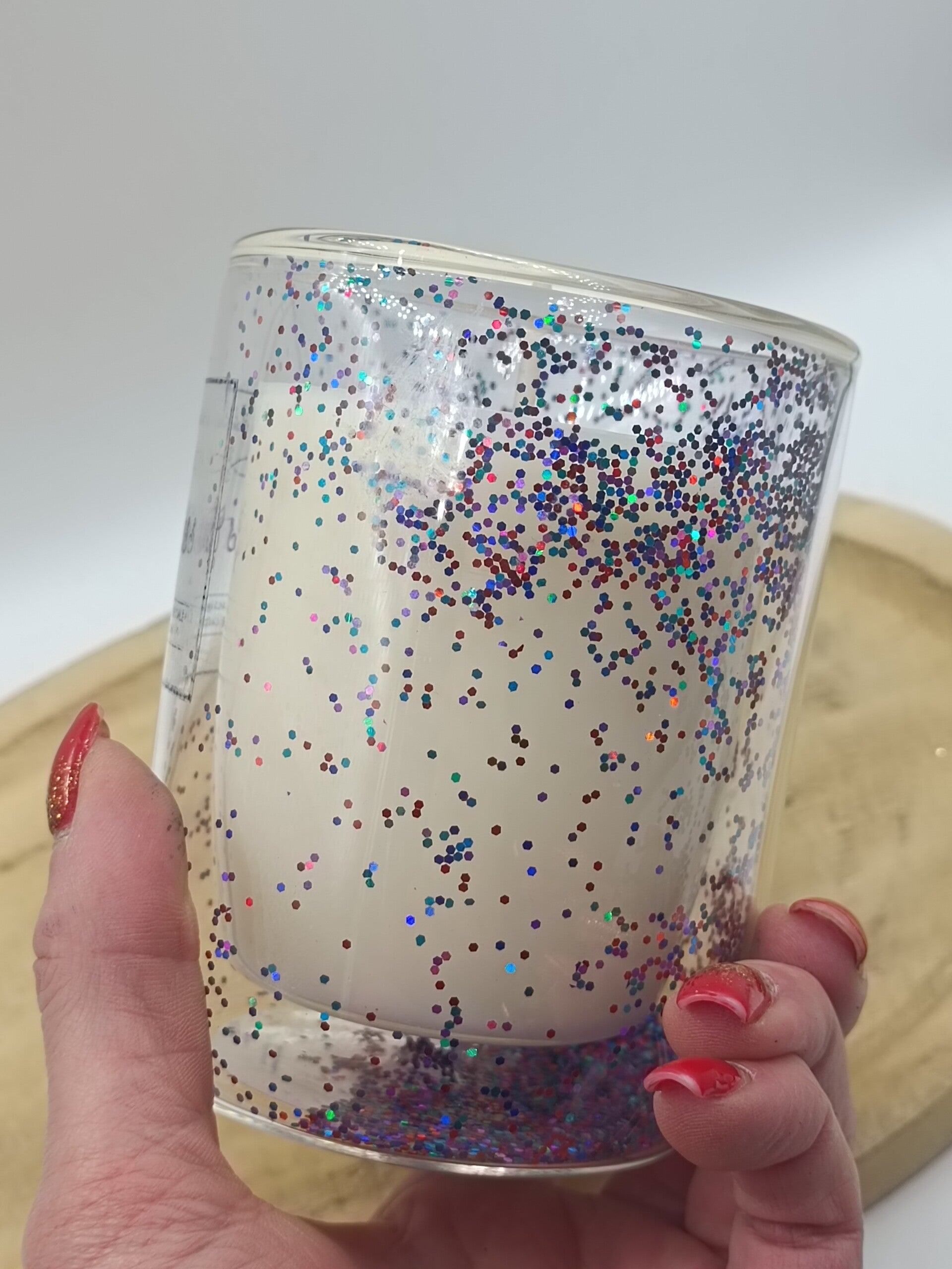 Découvrez la bougie scintillante de 240g, soigneusement coulée dans un élégant contenant à double paroi, rehaussé de paillettes étincelantes. ✨Paillettes multicolores pour une explosion de gaieté et de magie.
