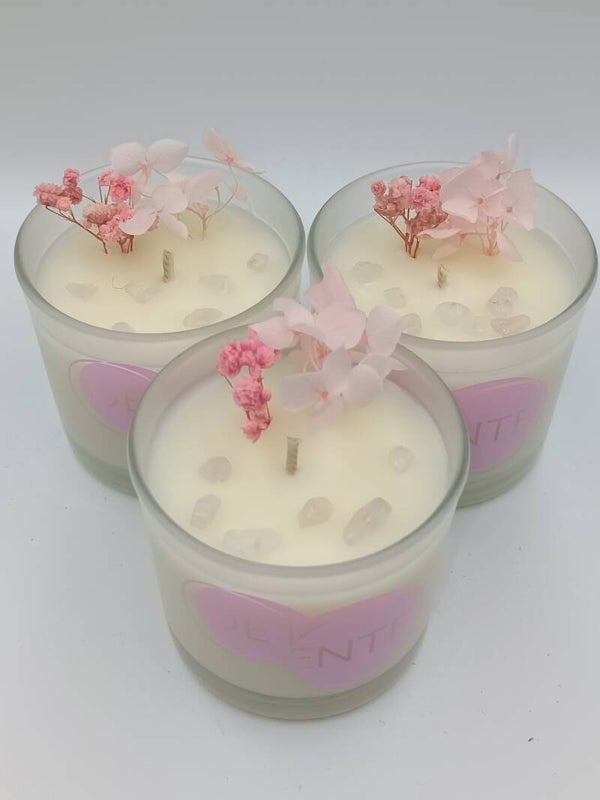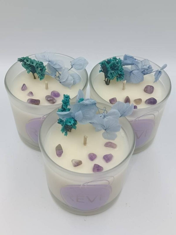 Chaque bougie est soigneusement coulée à la main à base de cire de soja 100% végétale, sans CMR ni additifs, et enrichie de pierres naturelles et de fleurs séchées pour sublimer l’expérience sensorielle et énergétique.